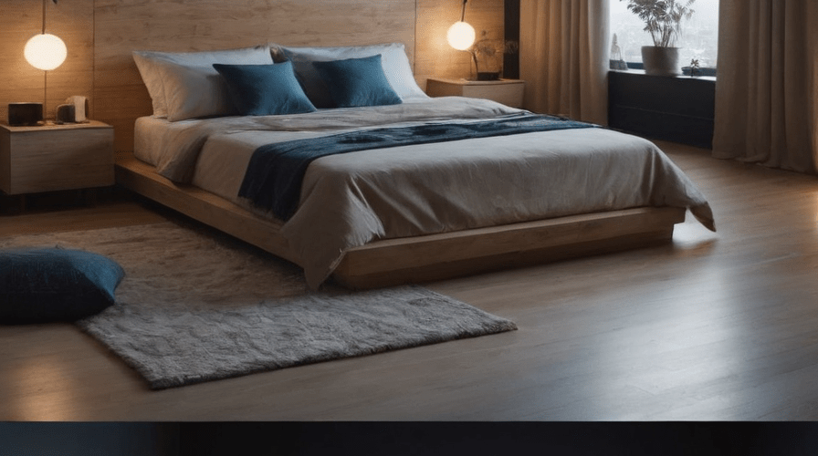 Prompt: Create a split-screen image that contrasts sleep in the past with sleep in the modern era. On one side, depict a peaceful, pre-industrial bedroom scene with a person sleeping by candlelight, surrounded by natural materials and simple furnishings. On the other side, show a contemporary bedroom with a person surrounded by modern sleep technology: a smart mattress, sleep tracking wearables, blackout curtains, and a smartphone on the nightstand emitting blue light. In the center, bridging both scenes, place an hourglass filled with stars and moon symbols instead of sand, symbolizing the passage of time and the unchanging need for sleep. Use a color palette that transitions from warm, natural tones on the historical side to cooler, tech-influenced hues on the modern side. Include subtle details that highlight the evolution of sleep habits, such as different sleeping positions and bedding styles.